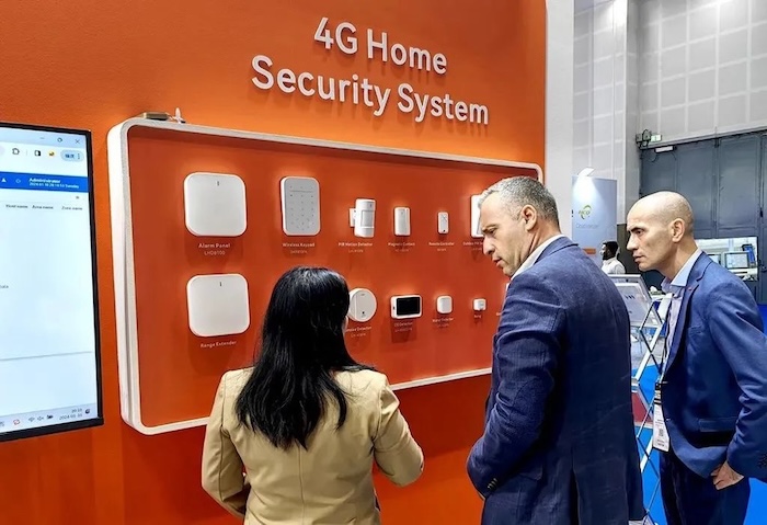 At booth SA-L41, the scene displayed 4G home security system, smart home sensor system, professional security alarm system, perimeter intrusion alarm system, access control system and other five systems.