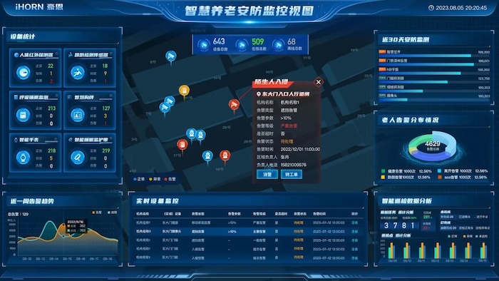 安全監(jiān)測設備(煙霧報警器、燃氣報警器、跌倒探測器、人體移動探測器、門窗傳感器、水浸傳感器等)可24小時在線監(jiān)測,一旦發(fā)現(xiàn)異常情況將實時告警,并將報警信息傳送至監(jiān)管平臺。機構(gòu)工作人員可迅速定位告警房間位置,把握黃金救援時間;