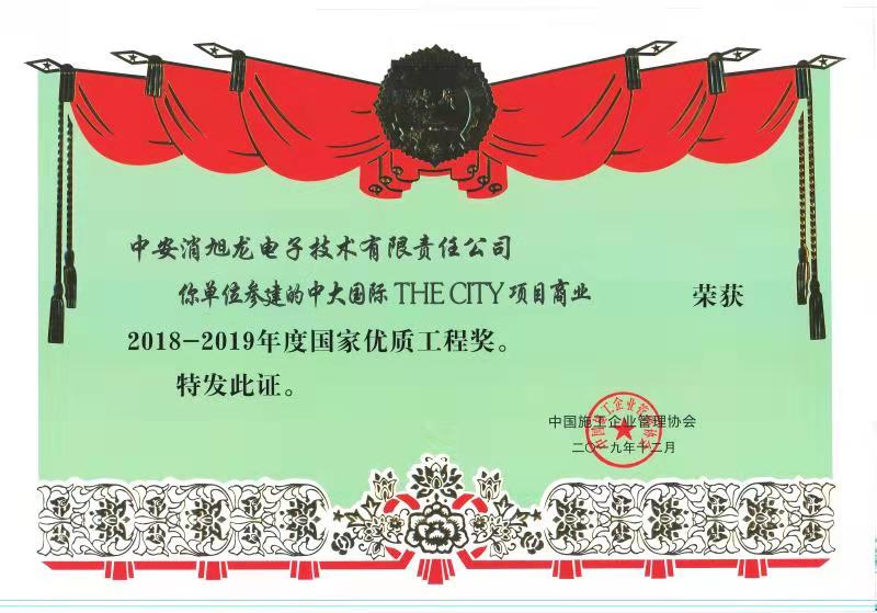 中安科股份子公司中安消旭龍電子技術(shù)有限責(zé)任公司(簡稱旭龍)參建的“中大國際THE CITY項(xiàng)目”摘得“2019年國家優(yōu)質(zhì)工程獎(jiǎng)”。