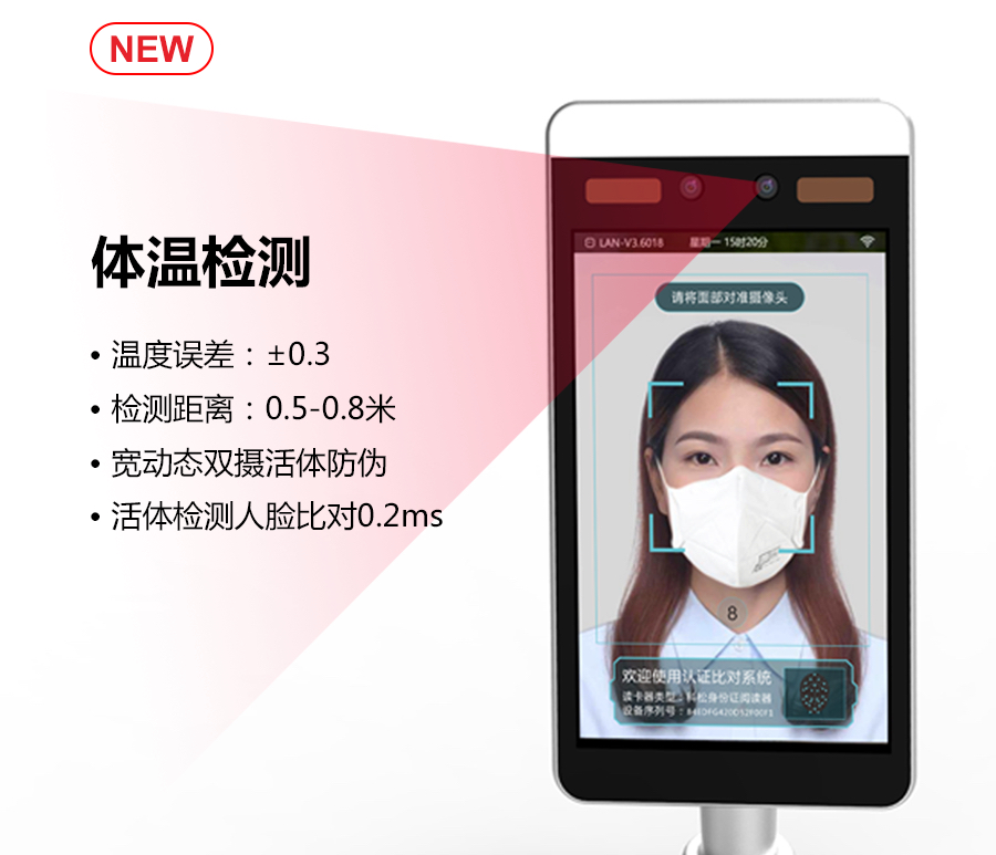 科松,集紅外非接觸式、±0.3℃高精度、高并發(fā)檢測等特點(diǎn)于一身,滿足全過程0接觸、遠(yuǎn)程部署、識別口罩等,可篩查體溫并記錄人員身份信息,實(shí)現(xiàn)出入管理、出入留痕、考勤簽到、前臺接待、服務(wù)咨詢等功能,提升服務(wù)品質(zhì),保障場所安全。同時(shí),可達(dá)2米的精準(zhǔn)測溫距離,讓設(shè)備布控與環(huán)境適應(yīng)性更加靈活,有效保護(hù)現(xiàn)場防疫工作人員,及時(shí)檢測、阻止異常人員從而達(dá)到整體防疫防控成效。