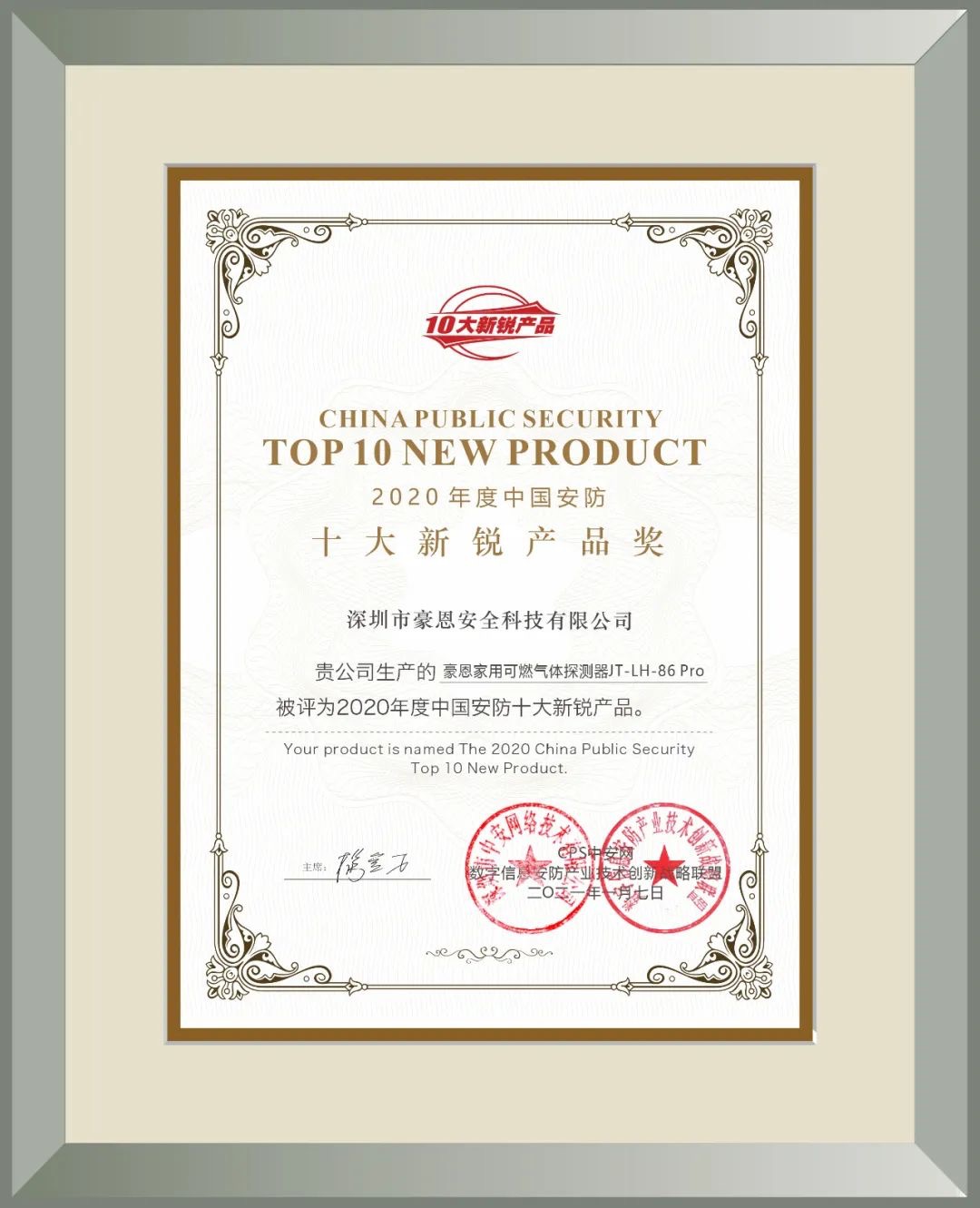 在團(tuán)拜會(huì)頒獎(jiǎng)典禮上,中安科股份成員公司 — 深圳市豪恩安全科技有限公司(以下簡(jiǎn)稱“豪恩”)的家用可燃?xì)怏w探測(cè)器 JT-LH-86 Pro 新品,榮獲了“2020 中國(guó)安防十大新銳產(chǎn)品”獎(jiǎng)項(xiàng),同時(shí)入圍的還有??低暋⒋笕A、華為、天地偉業(yè)等公司的新品。