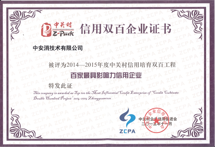 2015年11月17日,中關(guān)村企業(yè)信用促進(jìn)會發(fā)布了“2015中關(guān)村信用雙百企業(yè)”獲獎名單,中安消技術(shù)有限公司憑借多年積累的社會信任度以及對中關(guān)村科技、經(jīng)濟(jì)的貢獻(xiàn),再獲 “2015年中關(guān)村信用雙百企業(yè)——最具影響力企業(yè)”稱號。