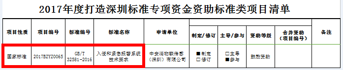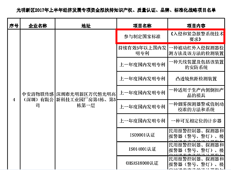 作為國家級高新技術(shù)企業(yè)及深圳市戰(zhàn)略性新興企業(yè),中安消物聯(lián)傳感(深圳)有限公司(原深圳市豪恩安全科技有限公司)高度重視標準化、體系化建設(shè)。因在國家標準制定方面所取得的突出成果,中安消物聯(lián)傳感獲得2017年度打造深圳標準和光明新區(qū)2017年上半年經(jīng)濟發(fā)展兩級政府專項資金的支持。