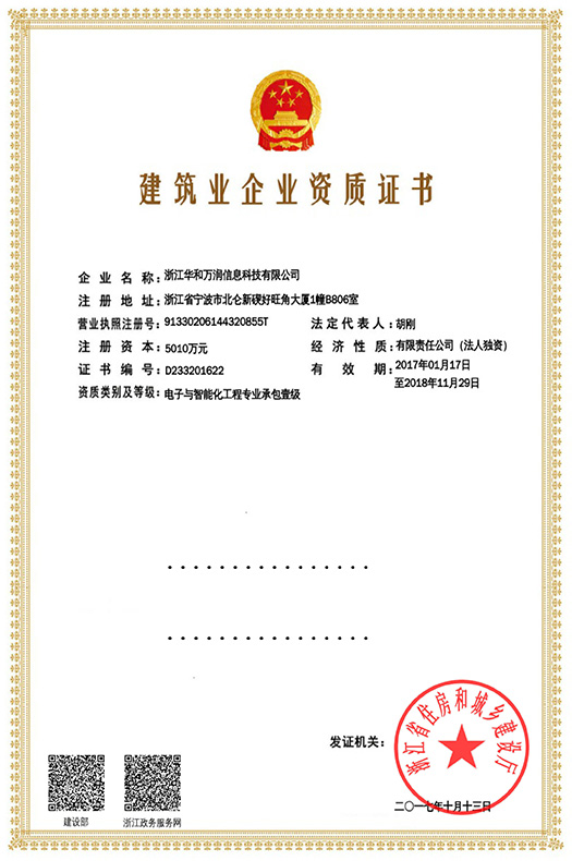 2017年10月13日,中安科股份成員企業(yè)浙江華和萬潤信息科技有限公司(以下稱華和萬潤),經(jīng)浙江省住房和城鄉(xiāng)建設(shè)廳核準(zhǔn)和近一年的嚴(yán)格審核與評(píng)估,憑借自身強(qiáng)大的技術(shù)實(shí)力和優(yōu)秀的業(yè)績背景,順利通過評(píng)審,成為電子與智能化工程專業(yè)承包一級(jí)資質(zhì)企業(yè)。