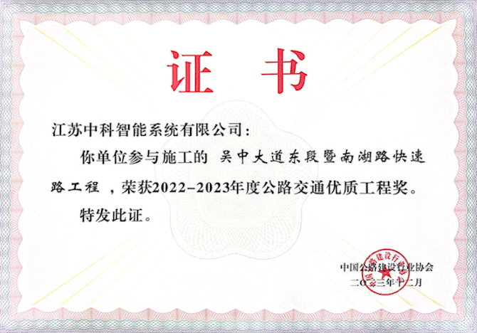 2024年1月13日,第五屆公路建設(shè)高質(zhì)量大會暨公路交通優(yōu)質(zhì)工程獎表彰大會在湖北武漢舉行,由中安科子公司江蘇中科智能系統(tǒng)有限公司(以下簡稱“中科智能”)參建的吳中大道東段暨南湖路快速路工程,獲評2022-2023年度公路交通優(yōu)質(zhì)工程,中科智能作為獲獎工程代表之一參加了表彰大會。