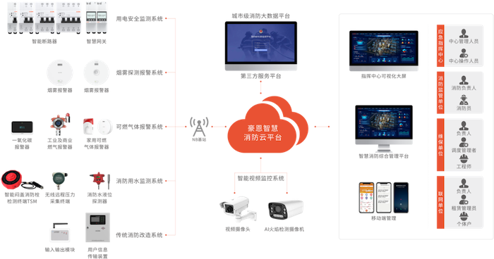 豪恩智慧消防解決方案以云平臺核心,搭載煙霧探測報(bào)警、可燃?xì)怏w報(bào)警、用電安全監(jiān)測、消防用水監(jiān)測等各個(gè)系統(tǒng),充分運(yùn)用5G、大數(shù)據(jù)、云計(jì)算、人工智能等前沿技術(shù),建成由監(jiān)控服務(wù)中心、云平臺、移動應(yīng)用、智能設(shè)備等組成的智慧消防火災(zāi)防控預(yù)警一張網(wǎng),實(shí)現(xiàn)水、電、煙、氣、火等在內(nèi)的實(shí)時(shí)監(jiān)測,讓火災(zāi)隱患無處遁形,打通智慧消防最后一厘米,讓消防更智慧,讓城市更安全。