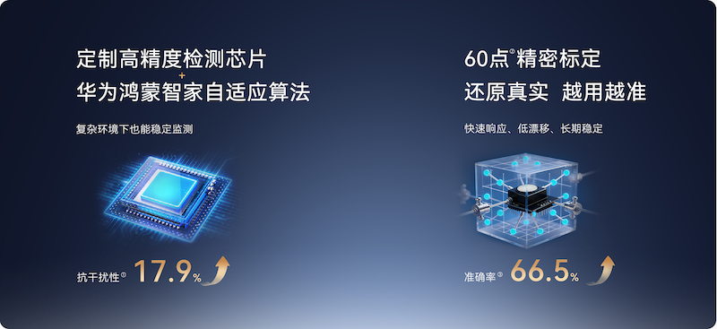 高精度檢測芯片搭載華為鴻蒙智家自適應(yīng)算法,能對每一路傳感器信號做實時補償與融合處理,保障傳感器即使處于復(fù)雜環(huán)境下也能穩(wěn)定探測,抗干擾能力提升17.9%*。