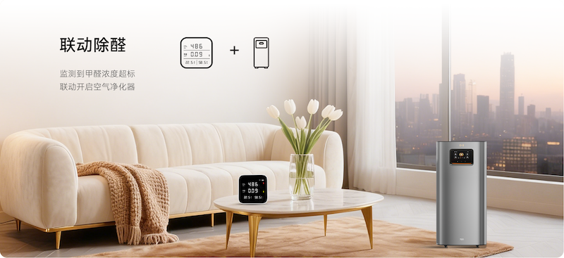 聯(lián)動除醛:當(dāng)豪恩空氣質(zhì)量檢測儀監(jiān)測到甲醛超標(biāo)時,自動聯(lián)動空氣凈化器進行凈化。新裝修用戶無需頻繁往返開窗,省時省心。