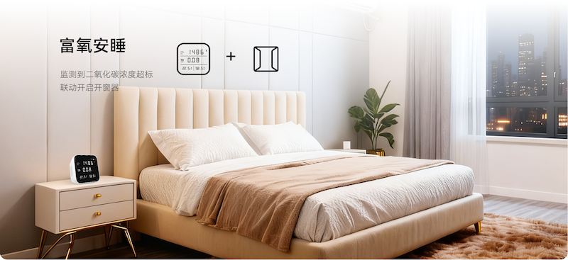富氧安睡:當(dāng)豪恩空氣質(zhì)量檢測儀監(jiān)測到二氧化碳濃度過高時,自動聯(lián)動開窗器通風(fēng),不影響睡眠,保障整夜富氧環(huán)境。